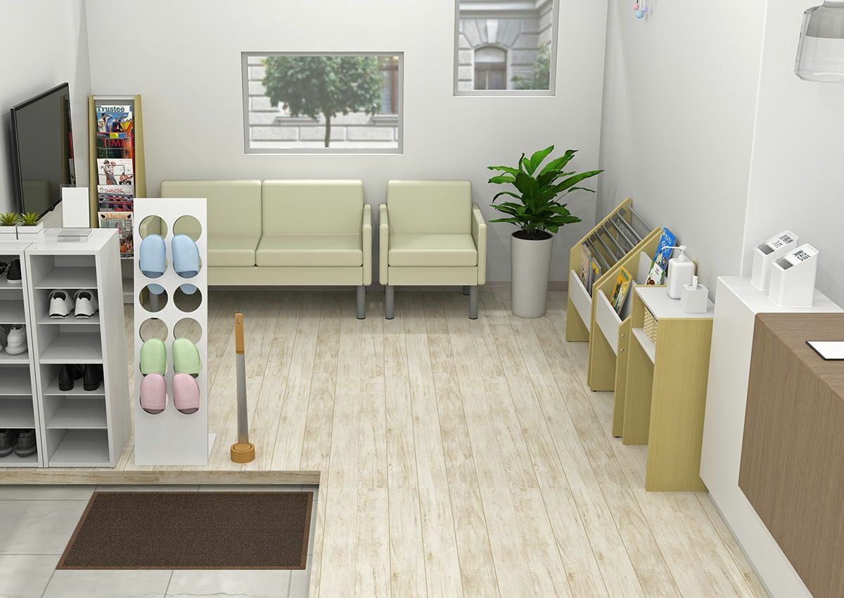 ▲ウッドの質感で待合室やエントランスをコーディネートできます