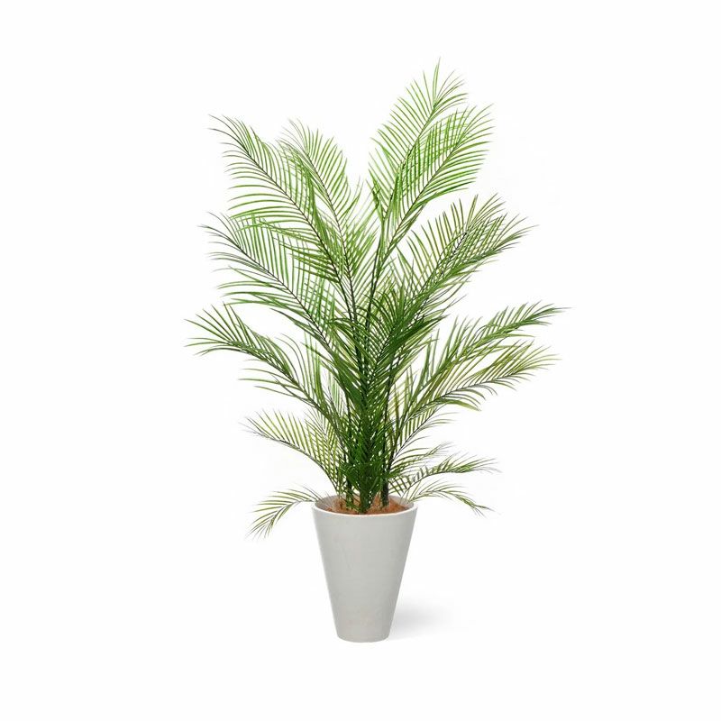 そんなアレカヤシを、マットな質感の白ベースにセットしました。円錐形で安定感があり、割れにくい合成樹脂製素材を使用しているので、うっかり倒しても安心です。