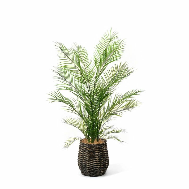 シーグラス(日本のイグサに似た天然水草)で編んだ天然素材の鉢カバーに合わせました。素朴な風合いと濃い目のブラウンは、アレカヤシの雰囲気にしっくり馴染みます。