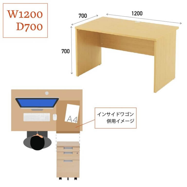 事務作業がはかどる幅1200mmのデスク。天板下にワゴンを設置でき、省スペースになります。 |