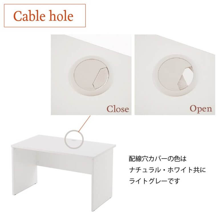 天板中央奥の樹脂製キャップ付き配線穴と幕板の切り欠きで配線対応。対面設置や壁付けレイアウトにも適しています。 |