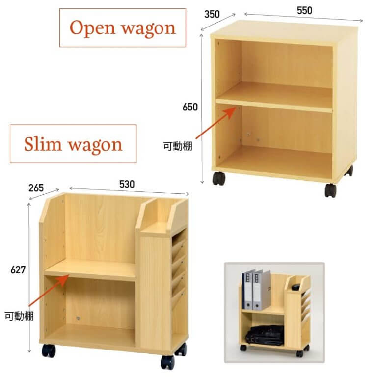 デスク周りでの資料共有や私物の保管に便利なオープンワゴンとスリムワゴン。フリーアドレスでも重宝します。 |