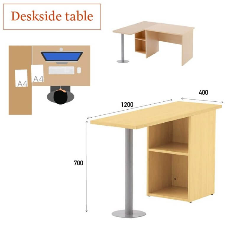 デスク横にサイドテーブルを設置すればL字型のワークデスクに。天板面積を拡張でき収納スペースもプラスできます。 |